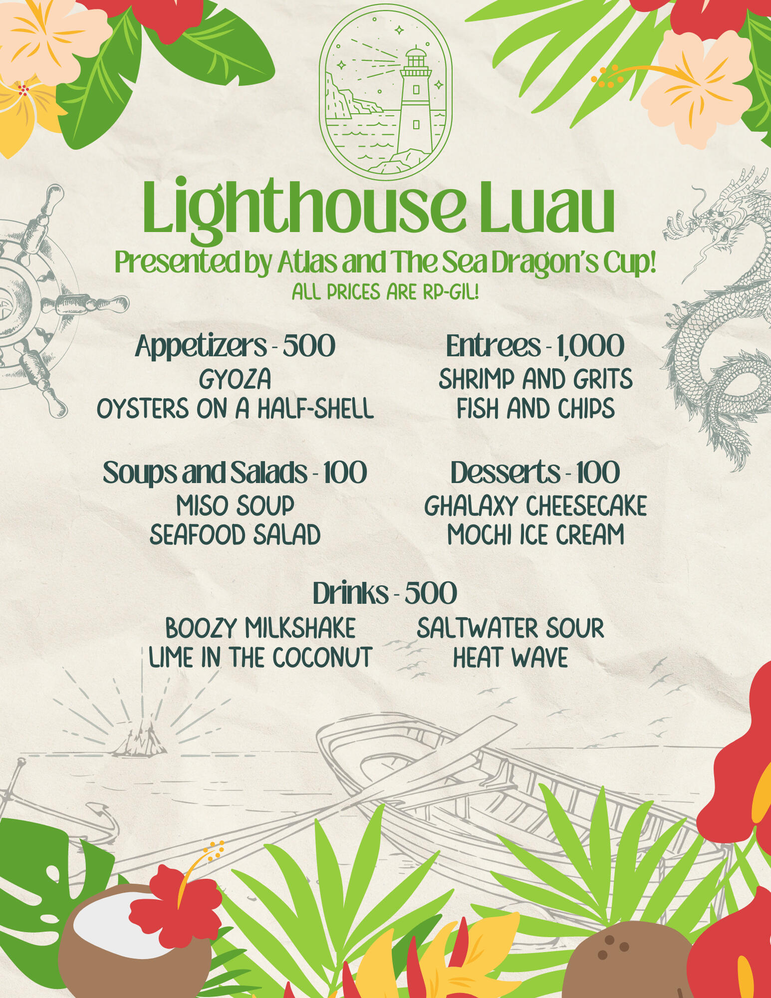 Atlas and the Sea Dragon's Cup are joining forces to bring you spring-themed luau on the Shirogane beach! Our outdoor café will feature a combined menu and staff from both of our venues, live music from our bard, giveaways, a bonfire, beach volleyball, a race to the top of the lighthouse, and more!Bring your swimsuit, throw on your RP tag, and come join us under the sun!